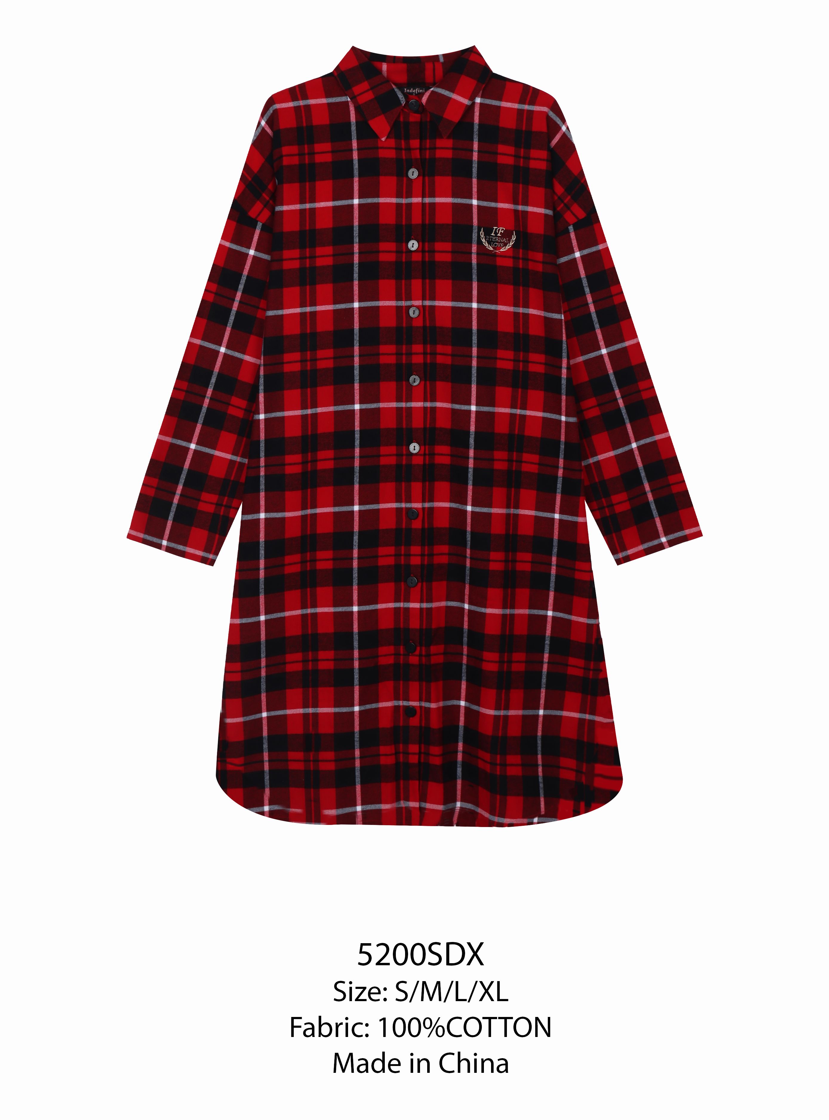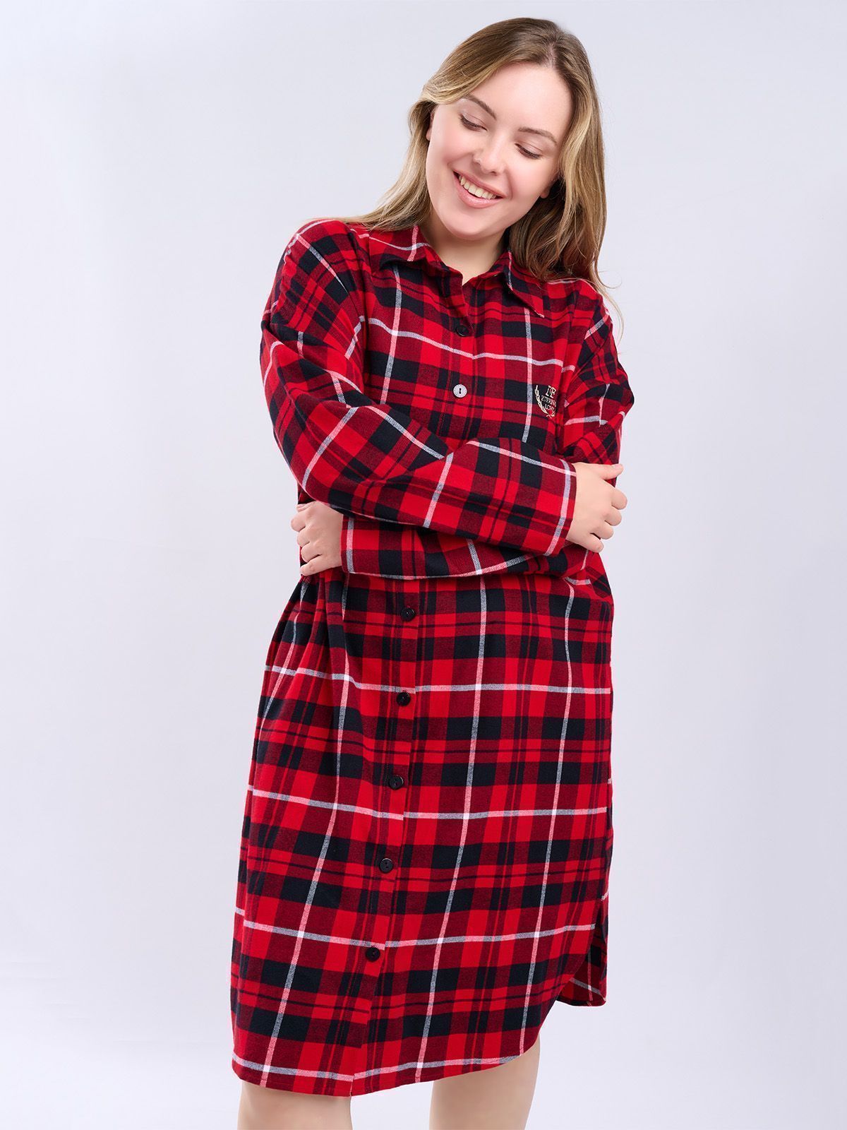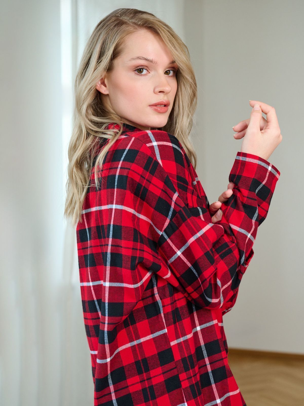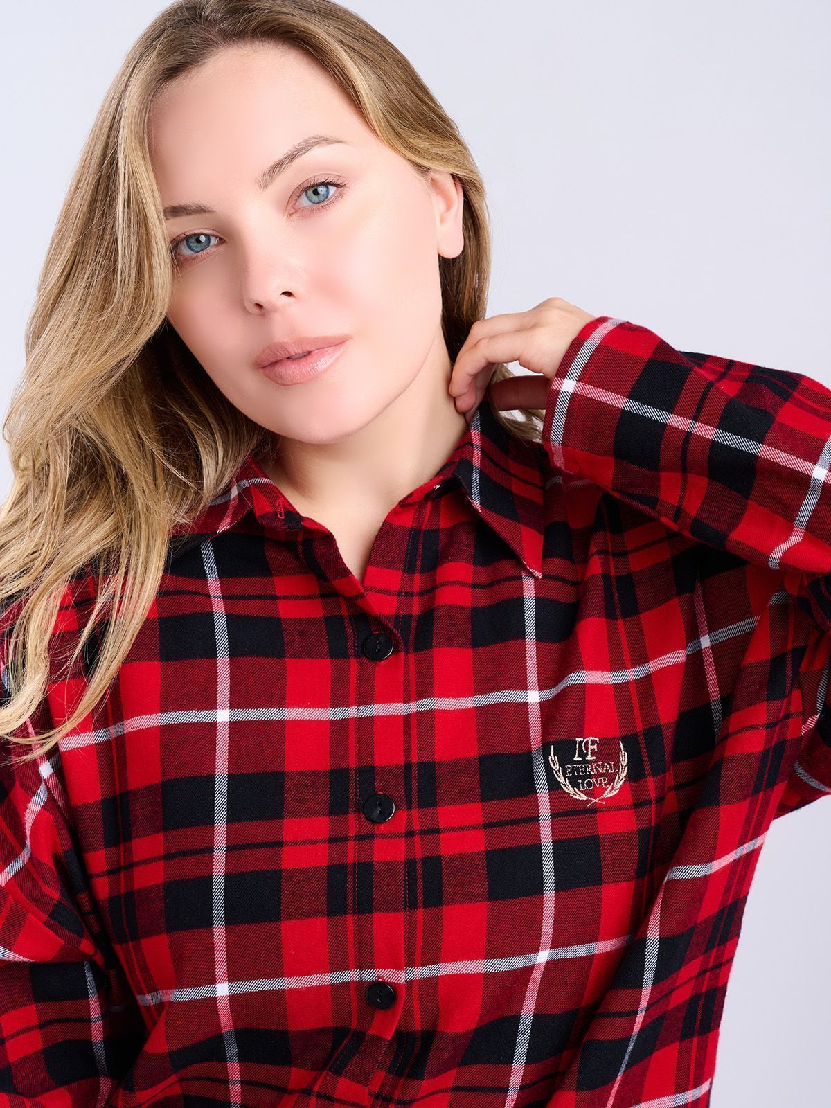 Сорочка в красно-черную клетку, свободного кроя с длинными рукавами и отложным воротником.
