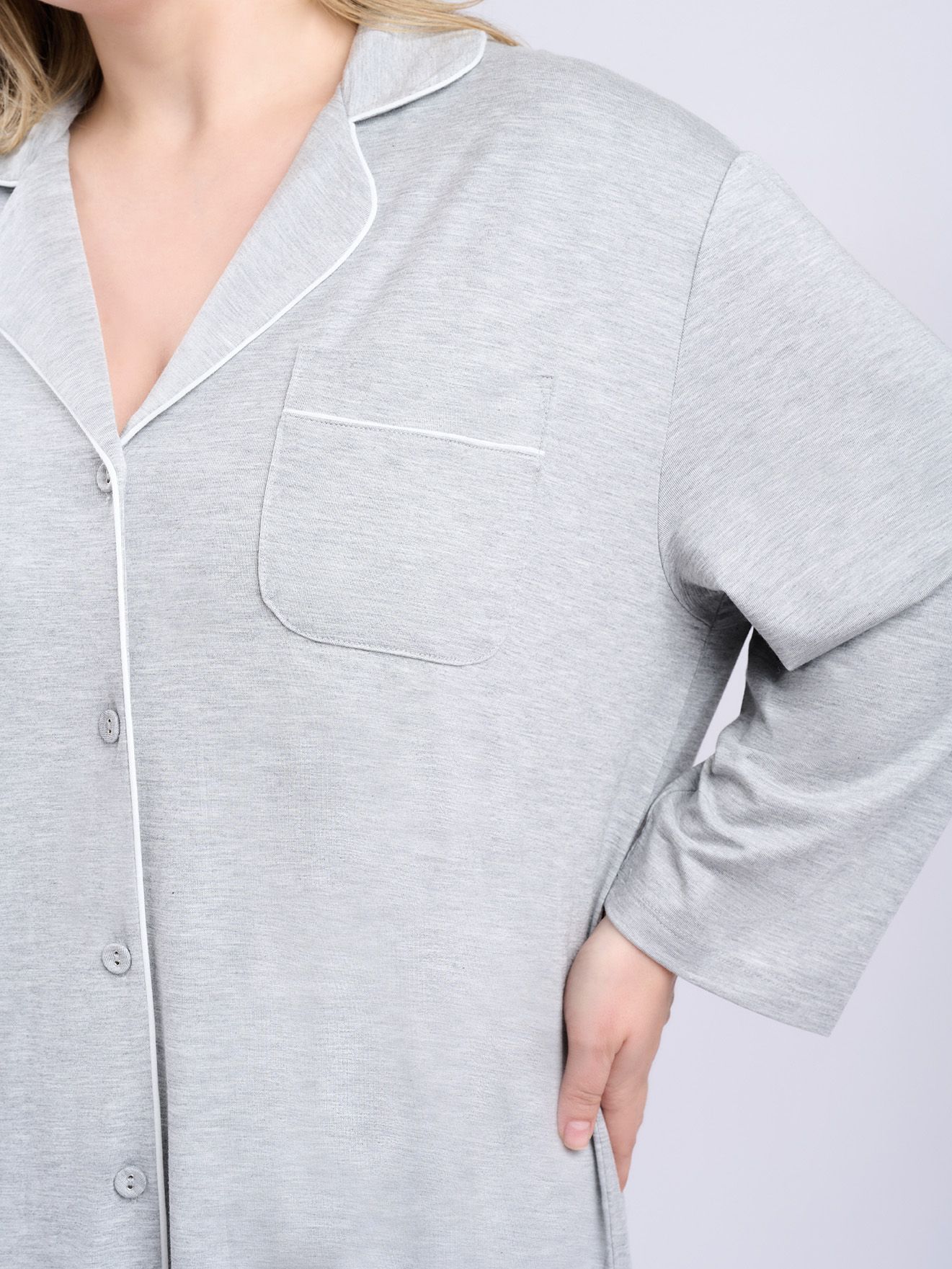 Сорочка имеет рукава 3/4, классический отложной воротник и застёжку на пуговицы по всей длине. На груди — накладной карман с контрастной отделкой, подчёркивающей лаконичный стиль изделия.