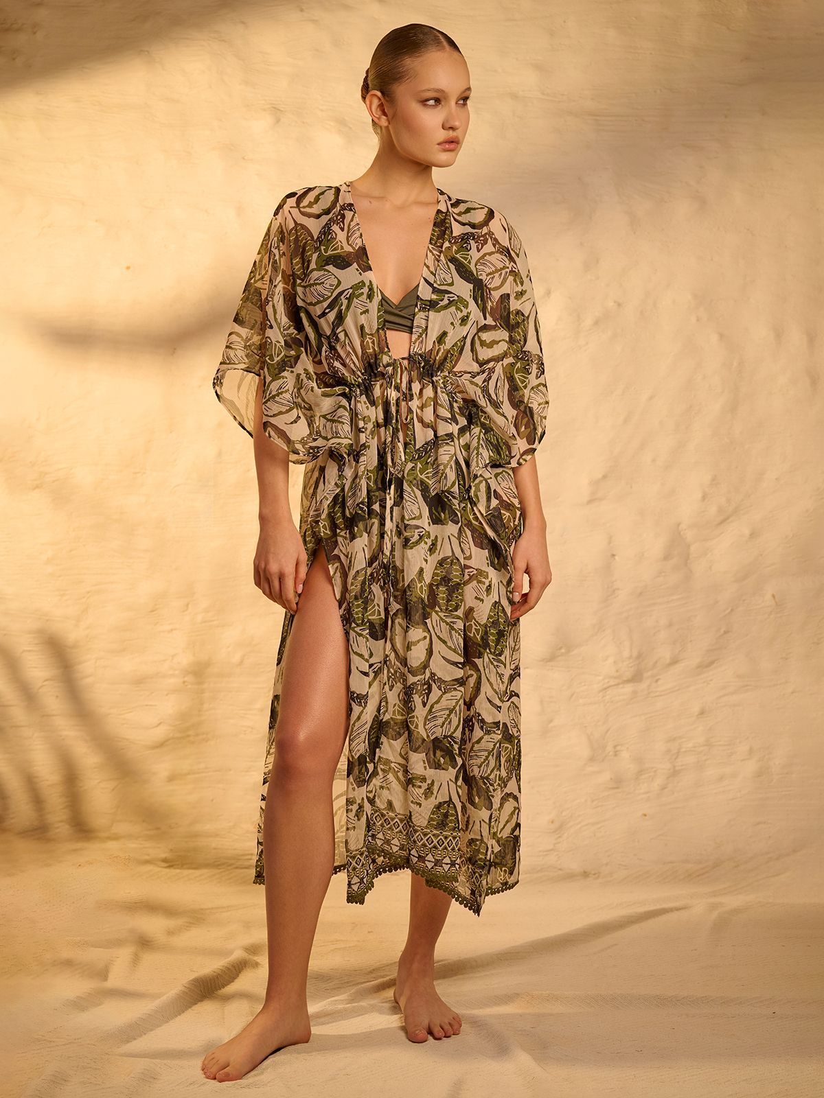 Стильная пляжная туника макси с широкими рукавами до локтя.